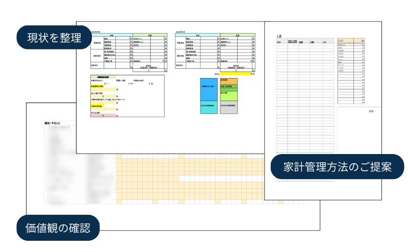 1年間のお金の動き・老後までの流れを見通したうえで、その人に合った家計管理方法を一緒に考え提案します。